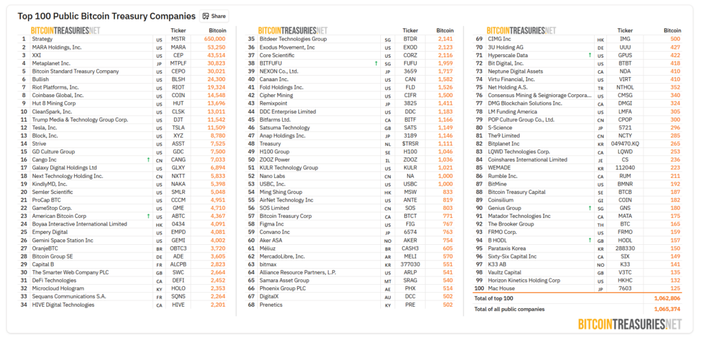 En güncel liste ve şirketlerin Bitcoin varlıkları için: BitcoinTreasuries.net