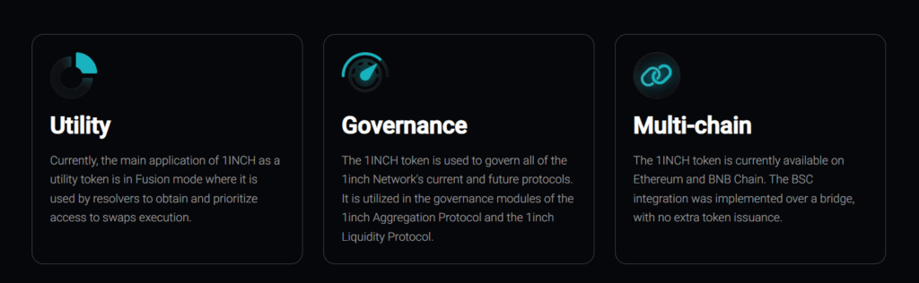 Governance (Yönetişim): 1INCH token, 1inch Network’ün mevcut ve gelecekteki tüm protokollerini yönetmek için kullanılır. Özellikle 1inch Aggregation Protokolü ve 1inch Likidite Protokolü’nün yönetim modüllerinde faydalanılır. Bu sayede token sahipleri, protokolün gelişimine ve ayarları üzerinde söz sahibi olarak protokole nasıl yön verildiğini belirler.