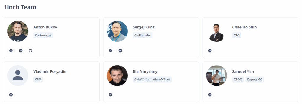 - 1inch Labs: Açık kaynaklı protokoller geliştiren ve 1inch DAO tarafından yönetilen yazılım geliştirme ekibidir. Sürekli olarak yenilik ve güncellemelerle ekosistemin gelişmesini sağlar.