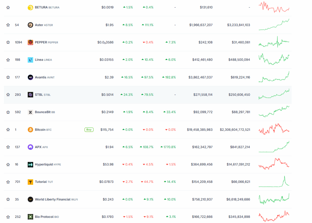Kripto para piyasası Türkiye’de yatırımcıların gündeminde kalmaya devam ediyor. Eylül 2025 itibarıyla öne çıkan altcoinler, güçlü yükselişler ve sert düşüşlerle dikkat çekiyor. Piyasanın en çok konuşulan projeleri arasında Aster, Avantis, STBL ve APX gibi coinler bulunuyor. Bununla birlikte, bazı kripto paralar değer kaybederek yatırımcıları tedirgin etti. Coingecko’ya göre Türkiye kripto para listesini inceledik.