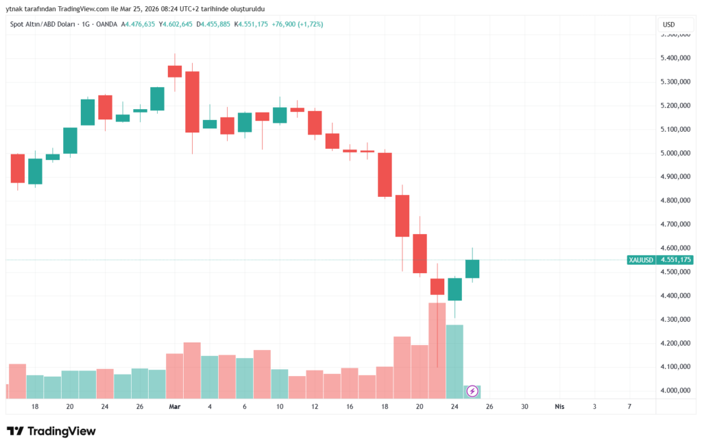 Altın fiyatları 25 Mart 2026 Çarşamba günü doların değer kaybetmesi ve Orta Doğu’daki çatışmanın sona erebileceğine dair haberlerin ardından güçlü bir yükseliş gösterdi. Ons altın %2’nin üzerinde artarken petrol fiyatlarındaki düşüş de küresel enflasyon baskısına dair beklentileri geçici olarak hafifletti.