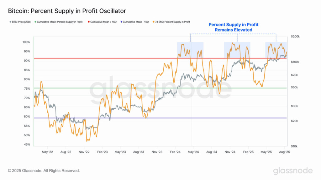 Glassnode verilerine göre, Bitcoin’in fiyatı yeni bir zirveye ulaştığında kârlı BTC arzı %99 seviyesine çıktı. Bu oran, Temmuz ayındaki düzeltme öncesinde %95 seviyelerinde seyretmişti. Ancak, kümülatif ortalama olan %92 ve bunun +1 standart sapma bandının altına hiç gerilemedi.