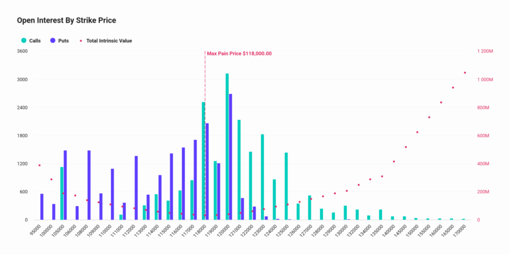 Deribit verilerine göre Bitcoin’in maksimum ağrı seviyesi 117.000 dolar olarak belirlendi. BTC, yazı sırasında 118.995 dolar seviyesinden işlem gördü. Vadesi dolan Bitcoin opsiyonları için put-call oranı 0,90 seviyesinde. Bu oran, call pozisyonlarının putlardan fazla olduğunu göstererek yükseliş eğilimine işaret etti. Bitcoin opsiyonlarının nominal değeri 4,78 milyar dolar olurken, açık pozisyon sayısı 40.185 kontrata ulaştı.