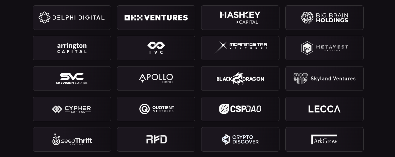 Aark Digital, Delphi Digital, OKX Ventures, Hashkey Capital, Big Brain Holdings, Arrington Capital, IVC, Morningstar Ventures, MetaVest Capital, SkyVision Capital, Apollo Crypto, Black Dragon, Skyland Ventures, Cypher Capital, Quotient Ventures, CSPDAO, Lecca, Seed Thrift, RFD, Crypto Discover ve ArkGrow gibi yatırımcılar tarafından desteklenir.