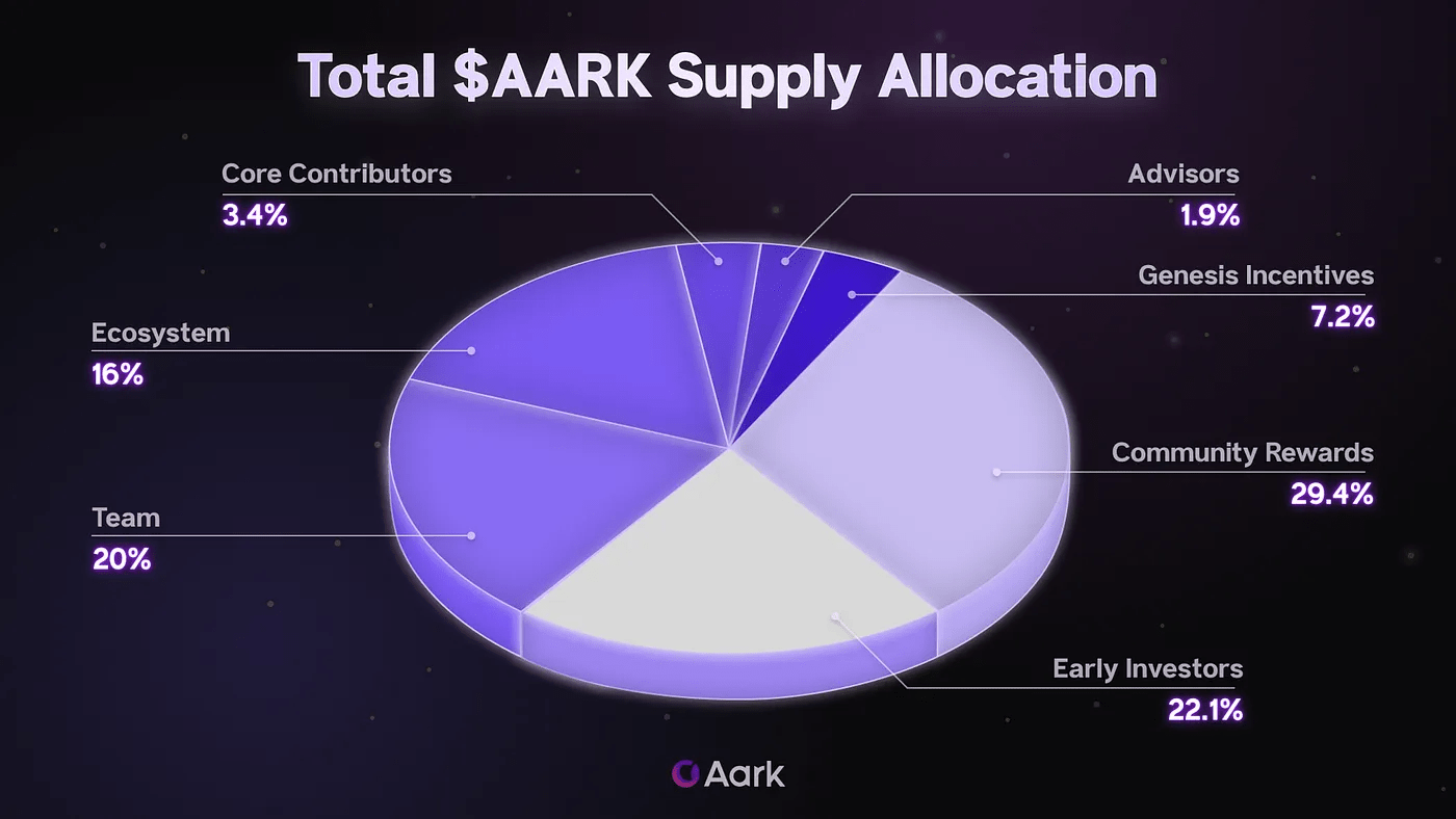 $AARK, Aark yönetişim ve fayda token’ıdır. Toplam Arz: 1.000.000.000. Başlangıç Likit Arz: TGE’de %4,4 (%6,9 toplam, %2,5 CEX/DEX Likiditesi dahil).