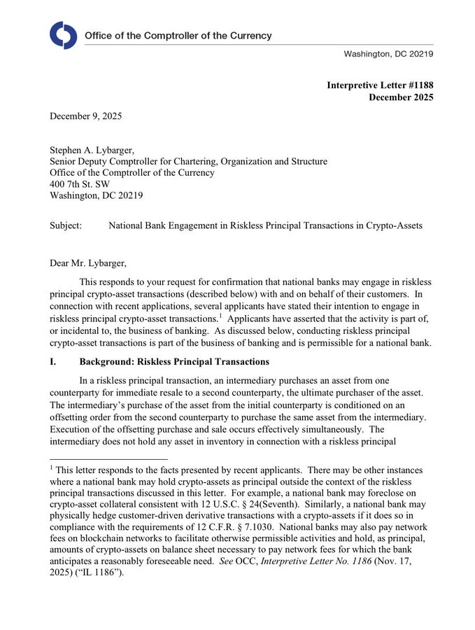 ABD Para Birimi Denetleme Ofisi (OCC) tarafından yayımlanan rehberde, bankaların “risksiz ana taraf” olarak bilinen işlem türlerine aracılık yapabileceği ifade edildi. Bu modelde: