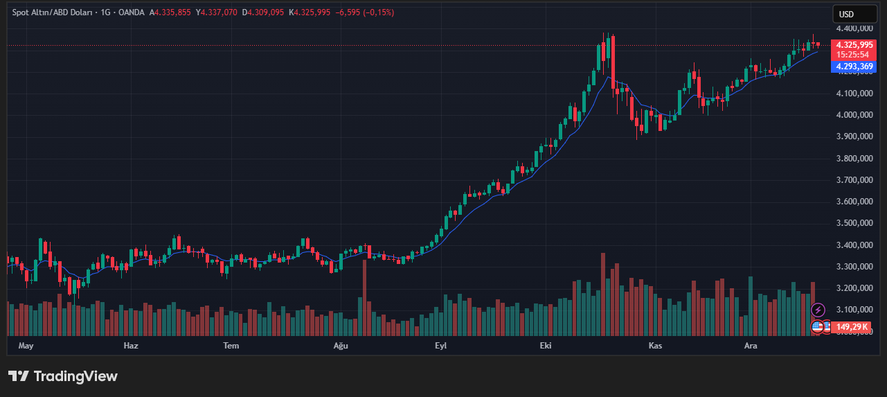 Spot altın, ons başına 4.325 dolar seviyesinde yatay seyrederek geceyi kapattı. ABD vadeli altın kontratları da benzer bir görünüm sergileyerek 4.346 dolar civarında işlem gördü. Böylece altın, haftayı sınırlı bir hareketle tamamlarken, genel olarak istikrarını koruyan bir görünüm sundu.