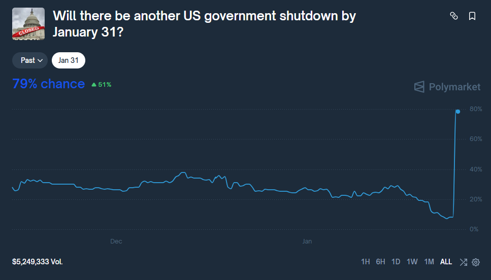 ABD merkezli tahmin piyasası Polymarket’te, Ocak ayı bitmeden yeni bir hükümet kapanması yaşanma ihtimali %79’a yükseldi. Sadece son 24 saatte görülen 67 puanlık sıçrama, Washington’daki bütçe çıkmazının yeniden derinleştiğine işaret ediyor.