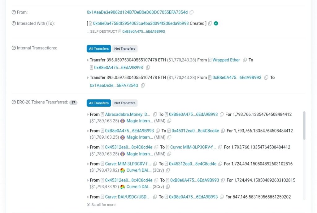 Abracadabra Money, son iki yılda üçüncü kez saldırıya uğradı. 2024 ve 2025 yıllarında sırasıyla 6,49 milyon dolar ve 13 milyon dolar değerinde kayıplar yaşamıştı. Blockchain araştırmacısı @officer_cia ve Weilin William Li’ye göre saldırgan, Abracadabra’nın güvenlik açığından yararlandı. Yaklaşık 1,7 milyon dolar MIM token’ı çekilip ~395 ETH ile değiştirildi.