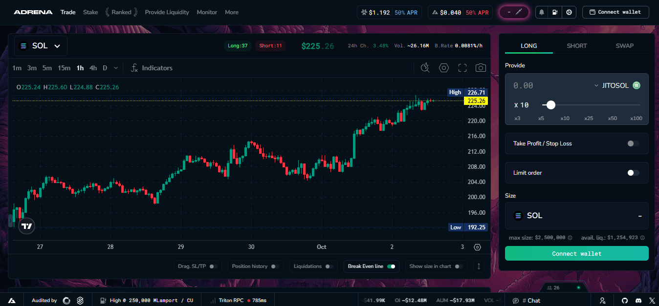 Adrena, peer-to-pool perpetual model ile çalışır; likidite sağlayıcılar (ALP sahipleri) trader’lara borç verir, sıfır kayma ticareti sağlar.