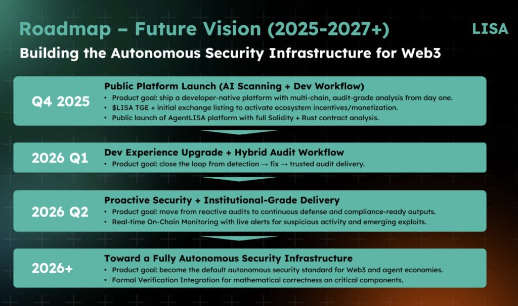 • 2025 Q4 (Halka Açık Lansman): Çoklu zincir desteği, Solidity ve Rust kontrat analizi ve $LISA TGE (Token Üretim Etkinliği) ile borsa listelenmeleri.