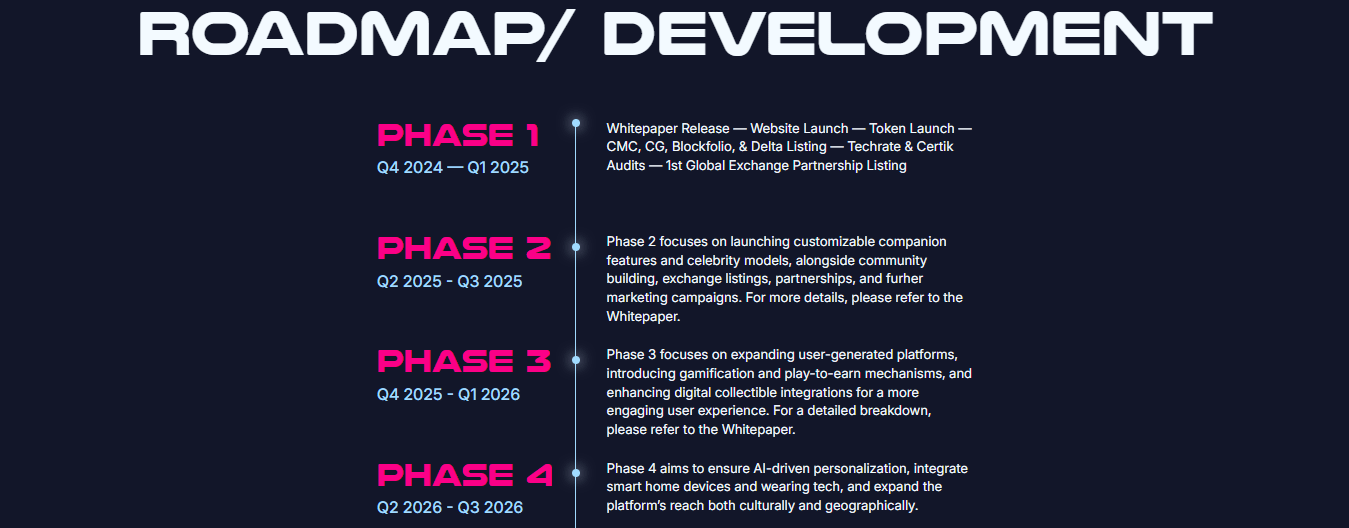 - Faz 2 (Q2 2025 – Q3 2025): Özelleştirilebilir companionship özellikleri ve ünlü modeller lansmanı, topluluk oluşturma, borsa listeleme, ortaklıklar ve pazarlama kampanyaları (detaylar için whitepaper’a bakın).