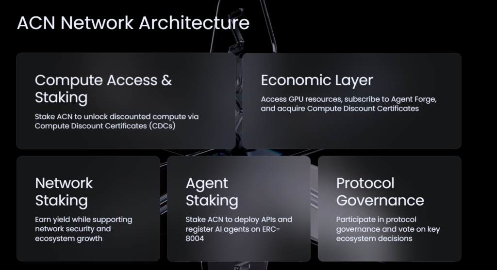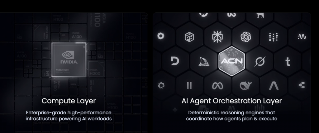 ACN’nin temelinde iki ayrı yapı bulunur. Birincisi yüksek performanslı işlem gücü sağlayan Compute Marketplace, ikincisi ise yapay zeka destekli otomasyon süreçlerini oluşturan Agent Forge platformudur. Bu iki yapı birbirinden bağımsız çalışır ancak aynı ekosistem içinde birleşir.