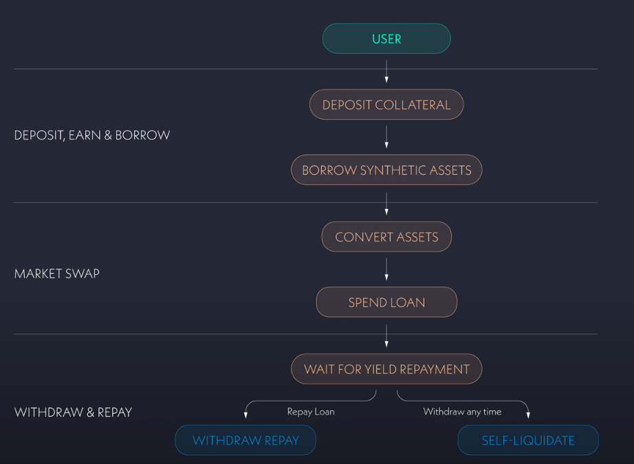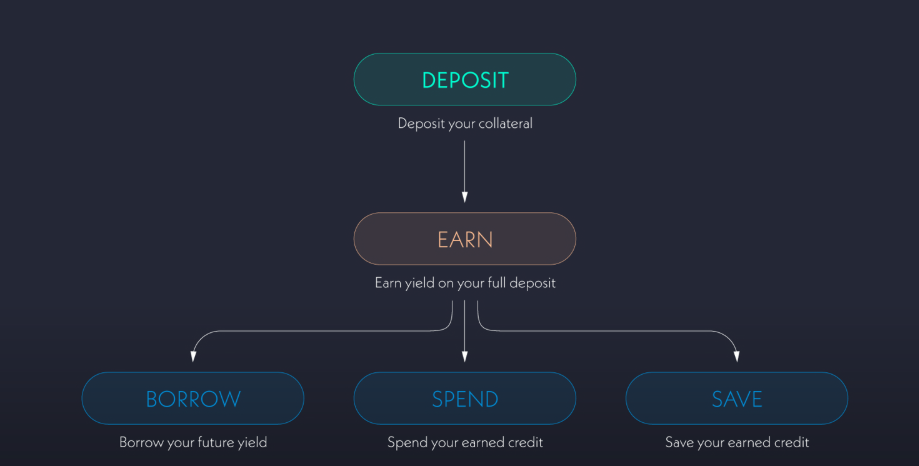 Depozit, Kazanç ve Borç Alma: Kullanıcılar teminatlarını (örn. DAI, ETH veya yield tokenlar) yatırır. Platform, bu teminat üzerinden getiri elde eder ve kullanıcıların borcunu otomatik olarak ödemeye başlar.