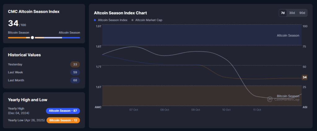 Kripto piyasasında dikkat çeken gelişmelerden biri, Altcoin Sezon Endeksinin düşüş trendine girmesi oldu. CoinMarketCap verilerine göre, 11 Ekim 2025 itibarıyla Altcoin Season Index 34/100 seviyesine gerileyerek piyasanın Bitcoin Season aralığına girdiğini gösteriyor. Ayrıca, 20 Eylül’de endeks 78 seviyesine yükselmişti.