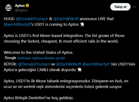 Katman-1 blok zinciri Aptos, Trump ailesinin World Liberty Financial şirketiyle USD1 stablecoin’leri dağıtmak için bir iş birliği yaptığını duyurdu. Bu iş birliği, Aptos ekosisteminde stablecoin kullanımını genişletmeyi ve kullanıcıların DeFi protokollerine kolay erişimini sağlamayı amaçlıyor.