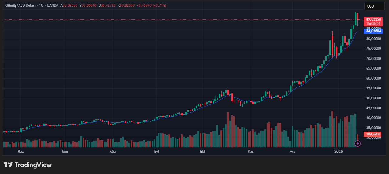 Değerli metallerdeki satış dalgası yalnızca altınla sınırlı kalmadı. Spot gümüş, gün içinde 93,57 dolar ile tarihi zirvesini gördükten sonra yüzde 5,5’lik sert bir düşüşle 87,62 dolara geriledi. Ardından haberin yazıldığı an tekrar 89 dolar seviyesine yükseldi!