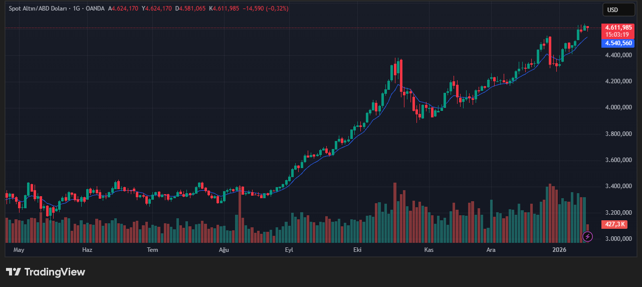 Spot altın fiyatı, gün içinde yüzde 0,4 düşüşle 4.611,71 dolar seviyesine geriledi. Bir önceki işlem gününde 4.642,72 dolar ile tüm zamanların en yüksek seviyesini gören altın, bu zirvenin ardından doğal bir düzeltme sürecine girdi. ABD vadeli altın kontratlarında da benzer bir tablo görüldü; Şubat vadeli kontratlar yüzde 0,9 düşüşle 4.594,10 dolara indi.
