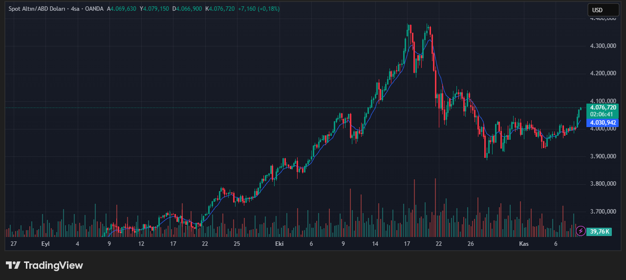 Altın fiyatları, yatırımcıların FED’in Aralık ayında faiz indirimine gidebileceğine yönelik beklentileri yeniden fiyatlamasıyla haftaya yükseliş ivmesiyle giriş yaptı. Küresel ekonomik aktivitedeki yavaşlama sinyalleri de güvenli liman talebini artırırken, ons altın haftanın ilk işlem gününde yüzde 1,90 prim yaparak 4.076,40 dolara kadar yükseldi.