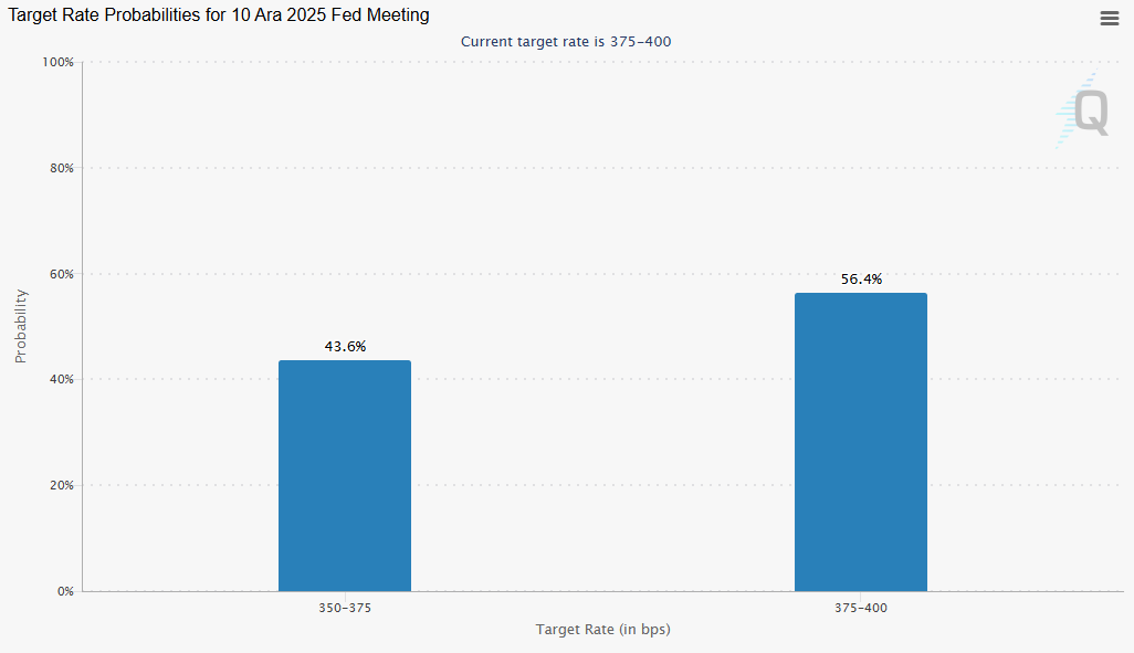 Faiz piyasalarında, yatırımcılar artık gelecek ay çeyrek puanlık (0.25) bir faiz indirimi olasılığını %43.6 seviyesinde fiyatlıyor. Fed’in faizi sabit bırakma ihtimali ise %56.4 olarak öne çıkıyor.
