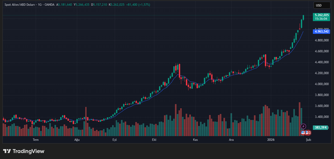 Haftanın başında sert bir yükseliş kaydeden altın, salı günü yüzde 3’ün üzerinde değer kazandıktan sonra çarşamba günü ilk kez 5.200 dolar seviyesini aştı. Spot altın, erken saatlerde ons başına 5.260 doların üzerinde işlem görerek yeni zirveleri test etti. Yılın başından bu yana altındaki toplam yükseliş yüzde 20’yi aşarken, fiyatlar kısa süre önce 5.262 dolar ile tüm zamanların en yüksek seviyesine ulaştı.