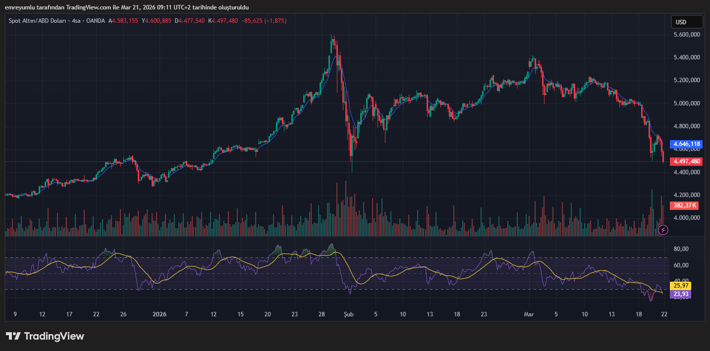 Küresel piyasalarda artan belirsizliklere rağmen altın fiyatlarında dikkat çekici bir geri çekilme yaşandı. Altın, haftalık bazda %11 düşüş kaydederek 1983 yılından bu yana en sert haftalık kaybını yaşadı. Haftanın son işlem gününde ons fiyatı %3,5 gerileyerek 4.488 dolar seviyesine kadar indi.