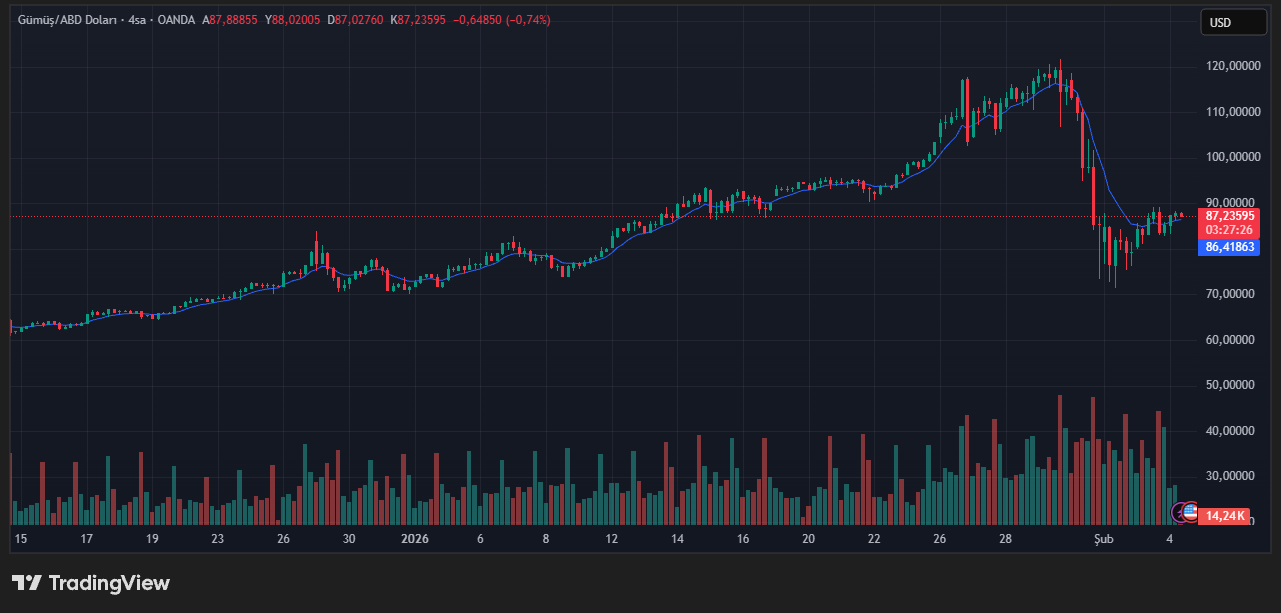 Gümüş %2,47’lik yükselişle 87,42 dolar seviyesinden işlem görüyor.