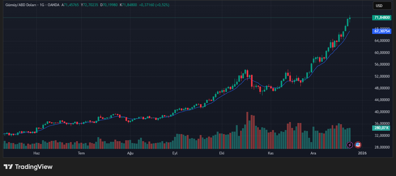 Yıl başından bu yana yüzde 149’a ulaşan yükselişiyle gümüş, aynı dönemde güçlü bir performans gösteren altını geride bıraktı. Teknik görünüm, yıl sonuna doğru daha yüksek seviyelerin test edilebileceğine işaret ediyor.