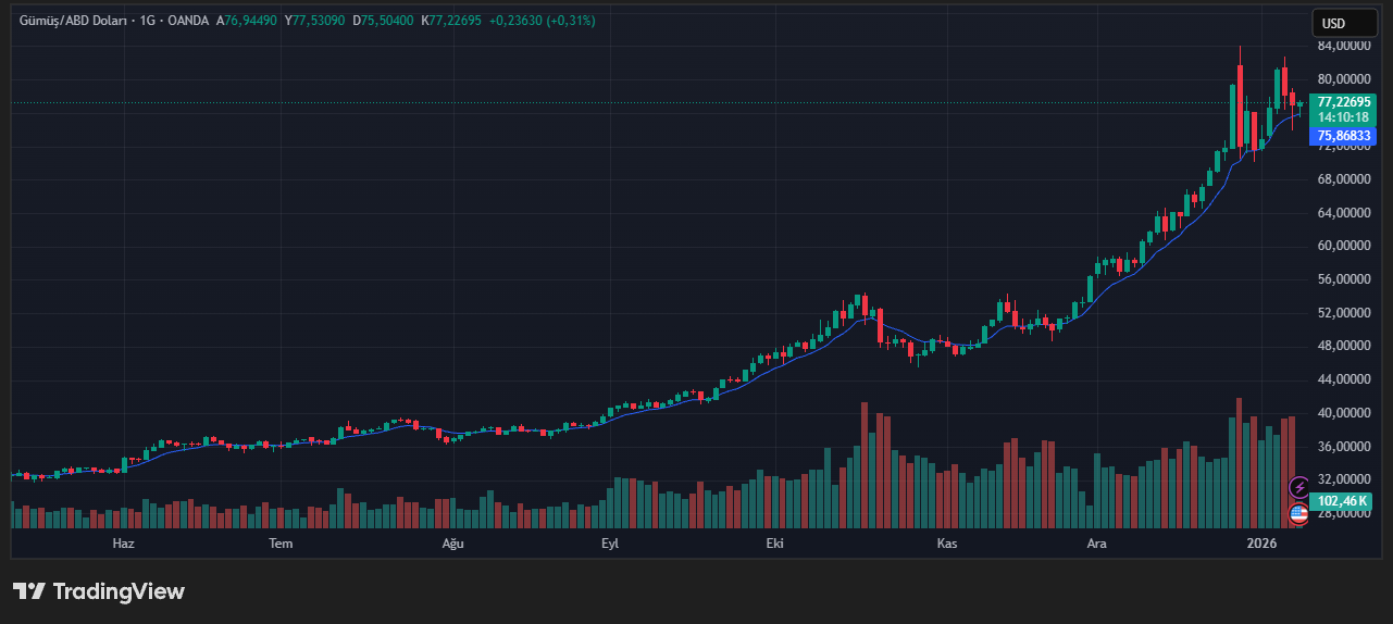 Spot gümüş, önceki rekor seviyesinin ardından yüzde 0,3 yükselişle 77,48 dolara ulaştı, haftalık bazda yüzde 5’in üzerinde kazanç elde etmeye hazırlanıyor.