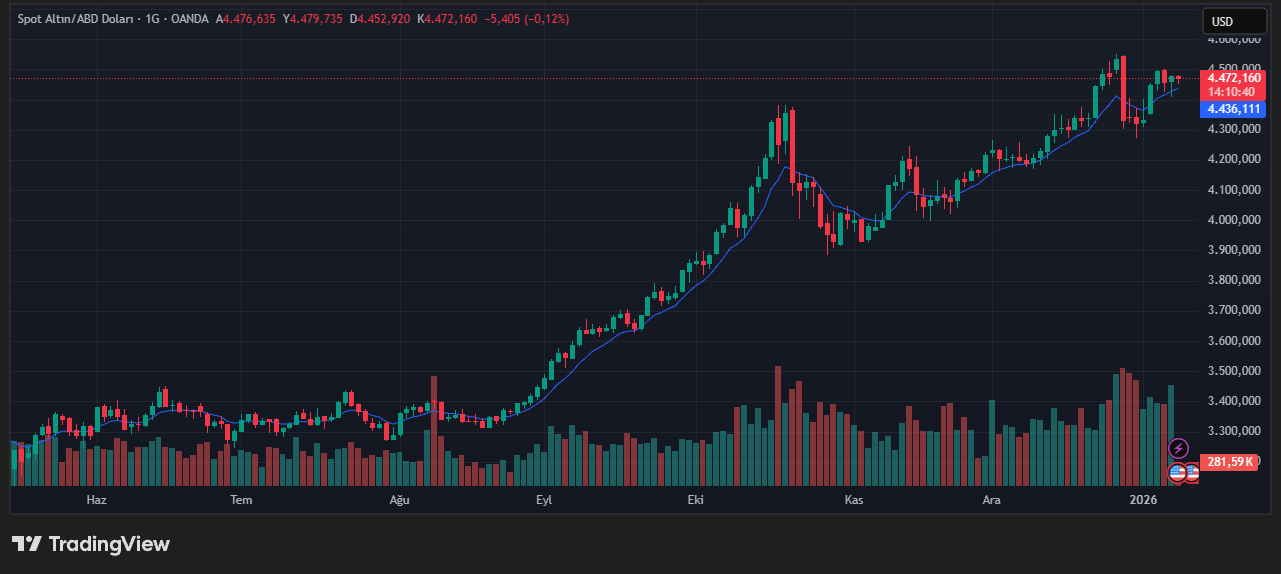 Spot altın fiyatı cuma günü yüzde 0,11 oranında düşüş yaşayarak ons başına 4.472,57 dolar seviyesine geriledi. Buna rağmen altın, haftalık bazda yaklaşık yüzde 3’lük yükselişle haftayı artıda kapatmaya hazırlanıyor. Hatırlanacağı üzere külçe altın, 26 Aralık’ta 4.549,71 dolar seviyesine ulaşarak tüm zamanların en yüksek fiyatını görmüştü.