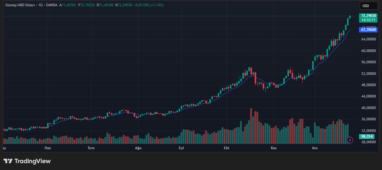 Altınla birlikte gümüş fiyatları da güçlü seyrini korudu. Daha önce 72,70 dolar ile tarihi zirvesini gören gümüş, %1,2 yükselişle 72,27 dolar seviyesinde işlem gördü.