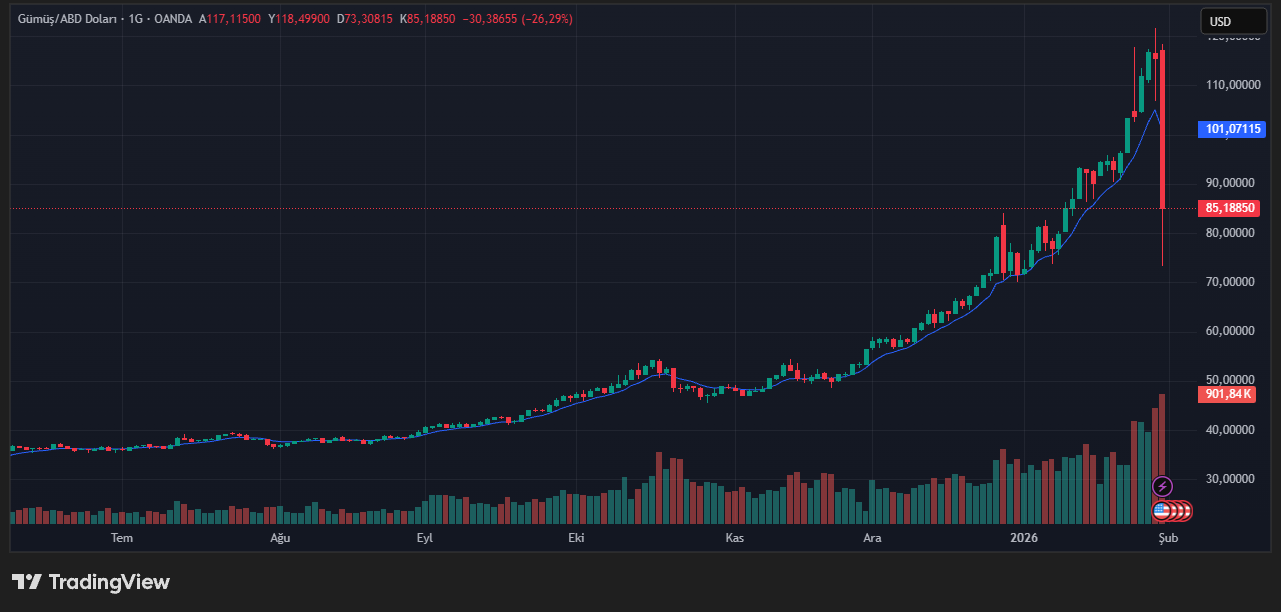 Cuma günü işlemlerinde altın fiyatı yaklaşık %9 değer kaybederek ons başına 4.877 dolar seviyesine gerilerken, gümüşteki düşüş çok daha sert oldu. Gümüş fiyatları New York seansında %28’e varan bir kayıpla 82 dolara kadar düştü. Bu hareketler, değerli metaller tarafında son yılların en yüksek volatilite seviyelerini beraberinde getirdi.