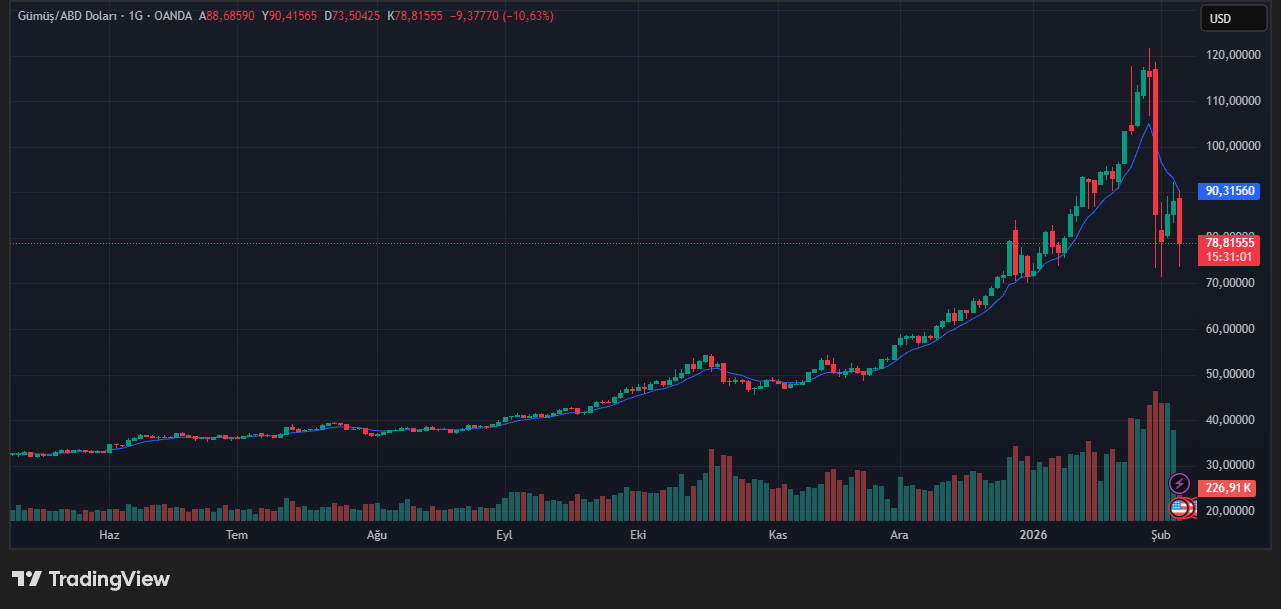 Gümüş cephesinde ise çok daha agresif bir satış dalgası dikkat çekiyor. Spot gümüş fiyatı %10’nin üzerinde düşerek 78,09 dolara kadar geriledi. Kısa süre önce 121,64 dolar ile tarihi zirvesini gören gümüşteki bu sert geri çekilme, yüksek fiyatların endüstriyel talep üzerinde yarattığı baskıyı net biçimde ortaya koydu. Analistler, özellikle Çin’deki güneş paneli üreticilerinin artan maliyetler nedeniyle alternatif arayışına yöneldiğine dikkat çekiyor.