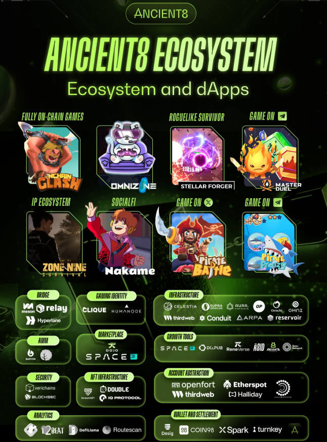 Ancient8, oyun geliştiricilerine ve oyunculara bütüncül bir ekosistem sunar. Bu ekosistem, oyun geliştirme araçları, pazarlama çözümleri ve kullanıcı onboarding araçları içerir.