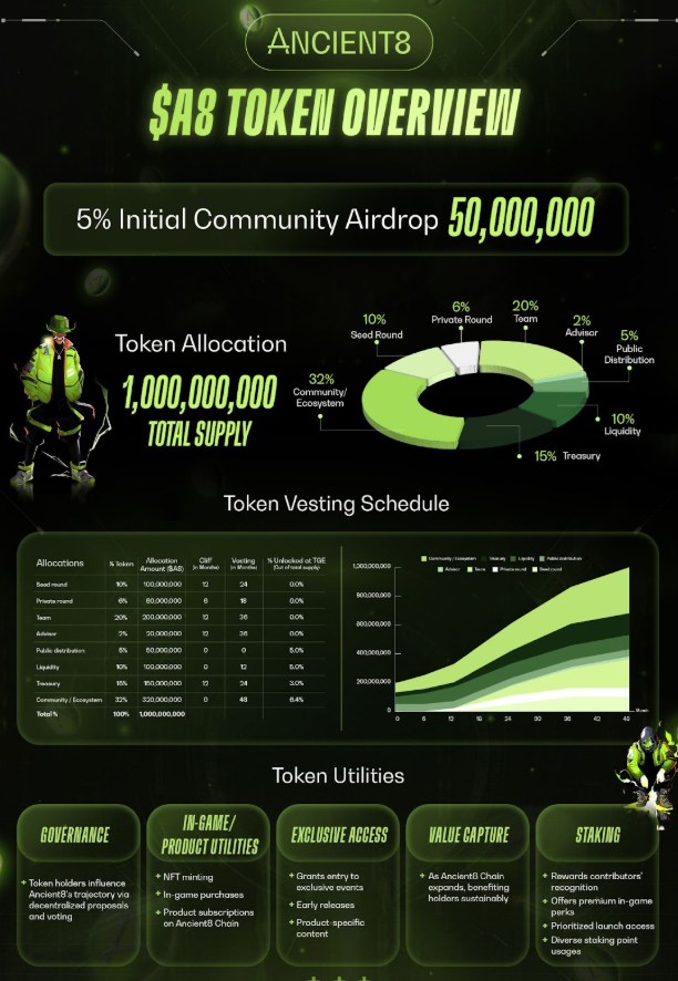 A8 token, Ancient8 ekosisteminin merkezi kripto para birimidir ve $A8 sembolü ile tanımlanır. Temel işlevi, Ancient8 Chain üzerinde işlemleri, yönetişimi ve ekosistem içi aktiviteleri desteklemektir.