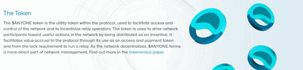 - Projenin ilk tokenomik mantığı ATOR Labs tarafından oluşturulmuştur (Proje, $ATOR‘dan $ANYONE‘a geçiş yapmıştır).