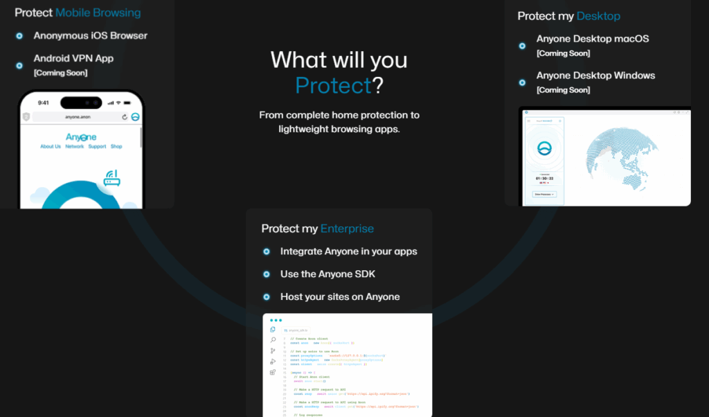 ANyONe Protocol, herhangi bir uygulamanın merkeziyetsiz bir gizlilik ağı üzerinde anında ve kolayca çalışmasını sağlayan bir protokoldür. DePIN (Decentralized Privacy Infrastructure Network) altyapısı ile evrensel gizlilik sunmayı hedefler. Proje, internet gizliliğinin temel bir hak olduğunu savunur ve kullanıcıların veri güvenliğini artırmak için merkeziyetsiz bir yaklaşım sunar.
