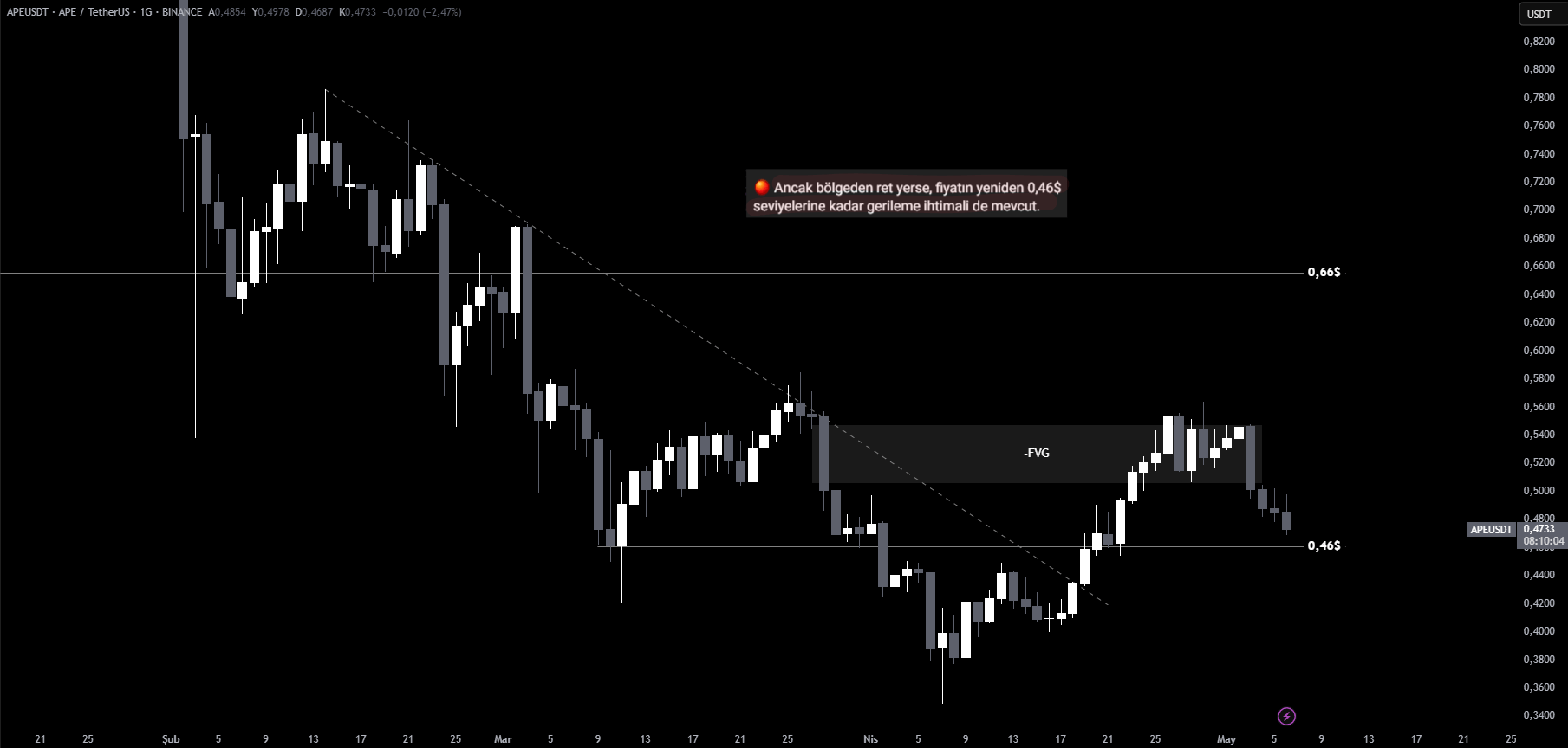 Eğer APE, 0,46$ seviyesinden güçlü bir alım tepkisi alırsa, yeniden FVG bölgesine doğru bir yükseliş hareketi görebiliriz. Bu senaryo kısa vadede toparlanma açısından önemli.