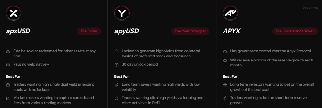 - apxUSD: Sentetik, getiri getirmeyen stabil varlık. Derin likidite ve DeFi/CeFi’de teminat kullanımı için tasarlanmıştır. Tasarım gereği aşırı teminatlı (over-collateralized) bir çerçevede tutulur.