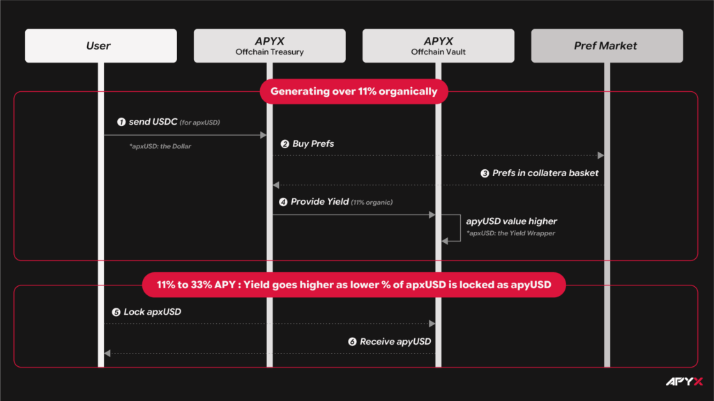 Kullanıcı app.apyx.fi üzerinden USDC ile apxUSD edinebilir (swap veya likidite havuzları yoluyla). İsteğe bağlı olarak apxUSD’yi kilitleyerek apyUSD alabilir.