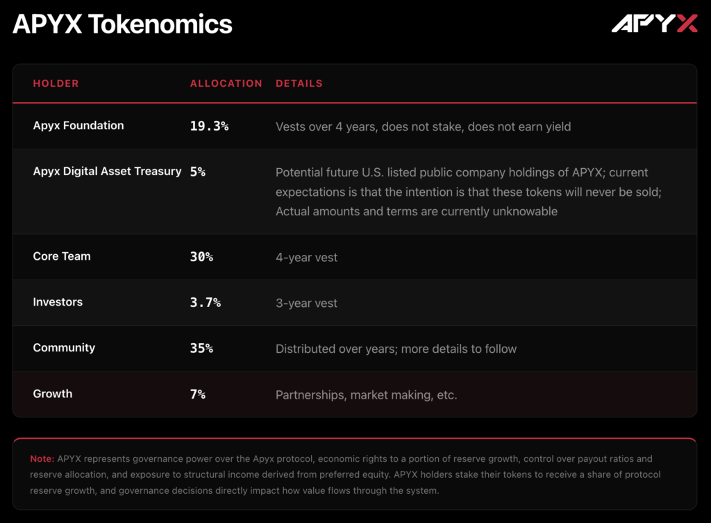 VC tahsisi bulunmamaktadır. Lansman itibarıyla rezerv büyümesinin %50’si APYX staker’larına dağıtılması planlanmakta, kalan %50’si rezervde kalarak teminatı güçlendirmektedir. Bu başlangıç parametresi olup, governance oylamasıyla değiştirilebilir. Ekip token’ları uzun vesting sürelerine tabidir.