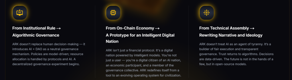 ARK, bir sonraki nesil DeFAI (Decentralized Finance × AI) protokolüdür. Amaç, akıllı algoritmalar ve DAO konsensüsü tarafından yönetilen, kendi kendine sürdürülebilir, modüler bir ekonomik sistem inşa etmektir.
