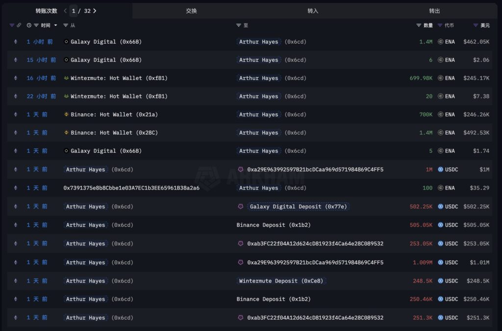 Arthur Hayes’in cüzdan hareketlerine bakıldığında, ilk olarak 755.000 USDC’yi Binance’e gönderdiği görülüyor. Bu transfer sonrası Hayes, Binance üzerinden 2,1 milyon ENA aldı. Ardından, 248.000 USDC karşılığında Wintermute üzerinden 700.000 ENA transfer etti. Son olarak Galaxy Digital platformuna 502.000 USDC göndererek 1,4 milyon ENA daha edindi.