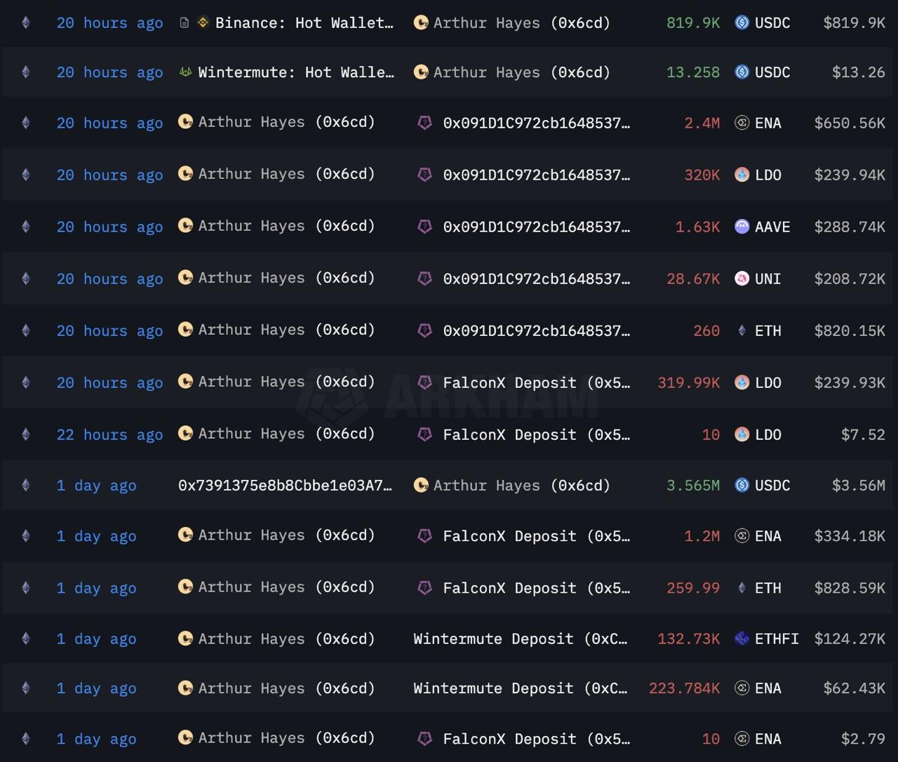 Onchain analiz platformlarının verilerine göre Arthur Hayes, günün ilk saatlerinde önemli miktarda kripto varlık transferi gerçekleştirdi. Hayes’in cüzdanından çıkan tokenler kurumsal piyasa yapıcılar olan Flowdesk, FalconX ve Wintermute gibi platformlara gönderildi. Bu tür transferlerin çoğunlukla satış amaçlı olduğu biliniyor.
