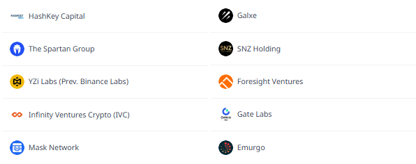 Aspecta, HashKey Capital, The Spartan Group, YZi Labs (eski adıyla Binance Labs), Infinity Ventures Crypto, Mask Network, Galxe, SNZ Holding, Foresight Ventures, Gate Labs, Emurgo, UpHonest Capital, CyberConnect, P12 Project Twelve, Bing Ventures, DoraHacks, ZhenFund, Taihill Venture, TSVCap, MiraclePlus ve The Y Startup Index Fund gibi güçlü yatırımcıların ve destekçilerin güvenini kazandı. Bu geniş destek ağı, projenin potansiyelini ve güvenilirliğini ortaya koyuyor.