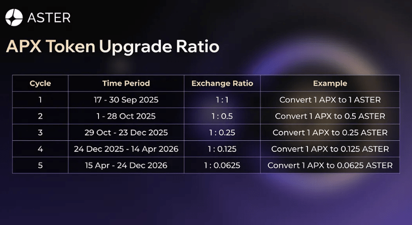 APX token sahipleri, APX tokenlerini $ASTER ile değiştirebilecek. Token yükseltme sayfası 17 Eylül 2025’te açılacak.