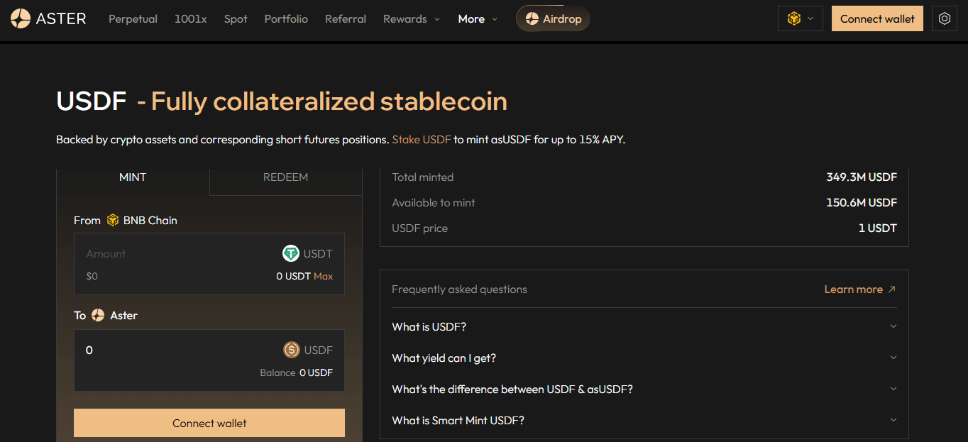 1. USDF Mint Etme: USDT ile Aster’de 1:1 USDF mint edin.