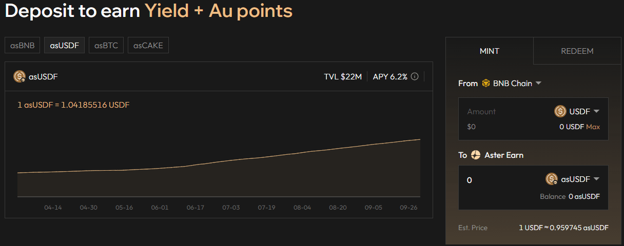 2. Stake Etme: USDF’yi Aster Earn’de stake ederek asUSDF kazanın; getiri ve Au Puan alın.