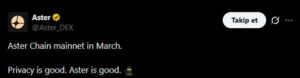 Aster Chain’in Layer-1 test ağı, 2025’in sonlarında sınırlı bir beyaz liste süreciyle başladı. Şubat 2026 başında ise herkese açık testnet aşamasına geçildi. Ekip tarafından paylaşılan bilgilere göre test sürecine 50.000’den fazla katılımcı dahil oldu. Mart ayında planlanan ana ağ lansmanı, projenin test aşamasından tam üretim (mainnet) ortamına geçtiğini resmen ilan edecek. Bu da Aster’ın altyapı tarafında olgunluk seviyesine ulaştığını gösteren önemli bir kilometre taşı olarak değerlendiriliyor.
