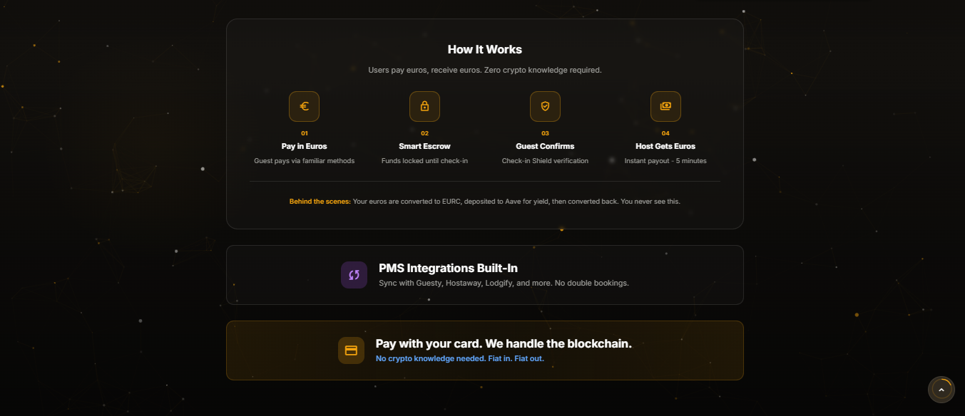 Ödeme olarak alınan euro, sistem tarafından EURC adlı stablecoin’e dönüştürülür. Ardından bu varlıklar DeFi protokolü Aave üzerinde değerlendirilerek getiri elde edilir. Rezervasyon tamamlandığında fonlar tekrar euroya çevrilerek ilgili kullanıcıya aktarılır.